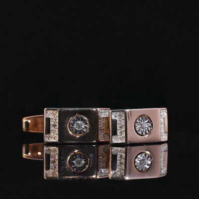 Запонки с 2 бриллиантами природными, 0.04 карат, огранка круг 57 граней, цвет 3, чистота 6, тип огранки А; 28 бриллиантами природными, 0.12 карат, огранка круг 17 граней, цвет 2, чистота 3, тип огранки Б; Розовое и белое золото 585 пробы.
