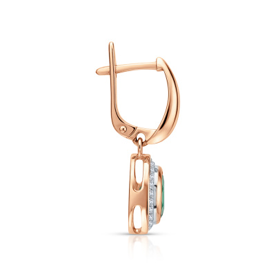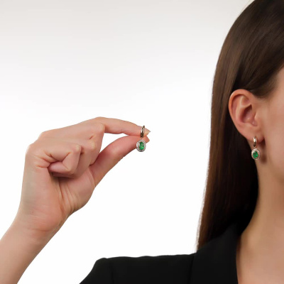 Серьги с 44 бриллиантами природными, 0.17 карат, огранка круг 17 граней, цвет 2, чистота 2, тип огранки А; 2 изумрудами природными, 1.32 карат, цвет 3, чистота 3, тип огранки Б; Розовое золото 585 пробы.