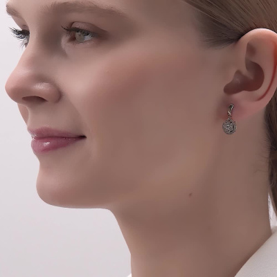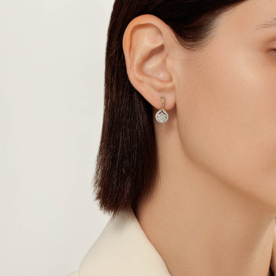 Серьги с 2 бриллиантами природными, 0.1 карат, огранка круг 57 граней, цвет 3, чистота 6, тип огранки А; 12 бриллиантами природными, 0.35 карат, огранка круг 57 граней, цвет 3, чистота 6, тип огранки А; 42 бриллиантами природными, 0.11 карат, огранка круг 57 граней, цвет 3, чистота 6, тип огранки А; Желтое и белое золото 585 пробы.