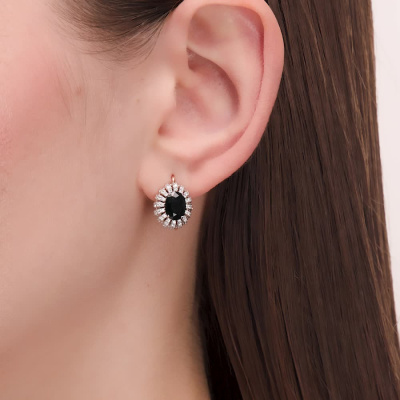 Серьги с 32 бриллиантами природными, 0.3 карат, огранка круг 57 граней, цвет 3, чистота 6, тип огранки А; 64 бриллиантами природными, 0.24 карат, огранка круг 57 граней, цвет 3, чистота 6, тип огранки А; 2 сапфирами природными, 2.69 карат, цвет 2, чистота 2, тип огранки Б; Розовое и белое золото 585 пробы.