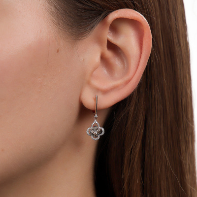 Серьги с 4 бриллиантами природными, 0.04 карат, огранка круг 57 граней, цвет 4, чистота 6, тип огранки А; 62 бриллиантами природными, 0.2 карат, огранка круг 17 граней, цвет 2, чистота 3, тип огранки Б; 8 бриллиантами коньячными природными, 0.44 карат, огранка круг 57 граней, цвет 7, чистота 6, тип огранки А; Розовое золото 585 пробы.