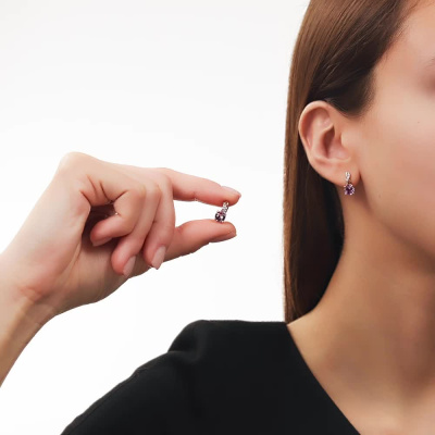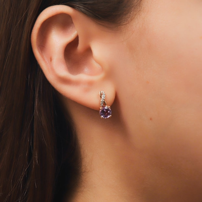 Серьги с 10 бриллиантами природными, 0.04 карат, огранка круг 17 граней, цвет 2, чистота 2, тип огранки Б; 2 аметистами природными, 1.57 карат; Розовое золото 585 пробы.
