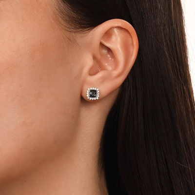 Серьги с 32 бриллиантами природными, 0.29 карат, огранка круг 57 граней, цвет 4, чистота 6, тип огранки А; 18 бриллиантами черными природными облагороженными, 0.14 карат, огранка круг 57 граней, цвет 7, чистота 6, тип огранки А; Белое золото 585 пробы.