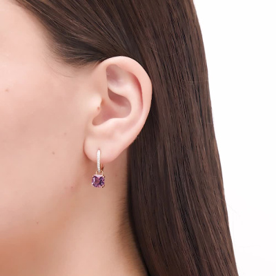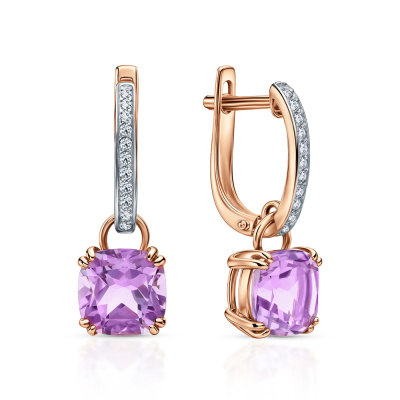 Серьги с 22 бриллиантами природными, 0.08 карат, огранка круг 17 граней, цвет 2, чистота 2, тип огранки А; 2 аметистами природными, 2.73 карат; Розовое золото 585 пробы.