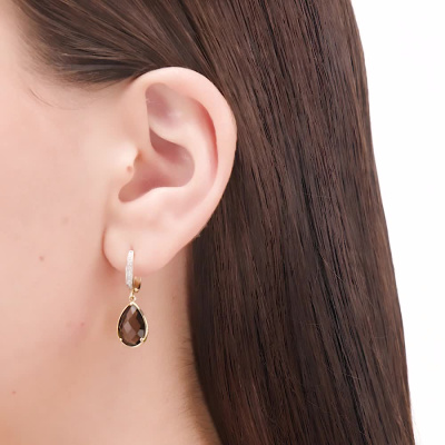 Серьги с 10 бриллиантами природными, 0.02 карат, огранка круг 17 граней, цвет 2, чистота 2, тип огранки А; 10 бриллиантами природными, 0.01 карат, огранка круг 17 граней, цвет 2, чистота 2, тип огранки А; 2 кварцами дымчатыми природными, 5.48 карат, тип огранки Б; Желтое золото 585 пробы.