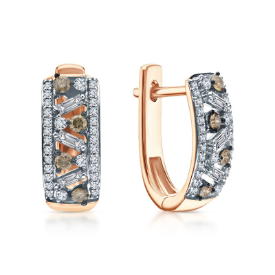 Серьги с 6 бриллиантами природными, 0.12 карат, огранка багет 25 граней, цвет 4, чистота 6, тип огранки А; 8 бриллиантами природными, 0.06 карат, огранка круг 57 граней, цвет 4, чистота 6, тип огранки А; 52 бриллиантами природными, 0.1 карат, огранка круг 17 граней, цвет 2, чистота 3, тип огранки Б; 8 бриллиантами коньячными природными, 0.16 карат, огранка круг 57 граней, цвет 7, чистота 6, тип огранки А; Розовое золото 585 пробы.