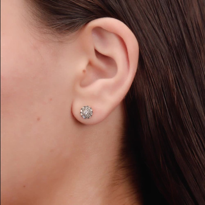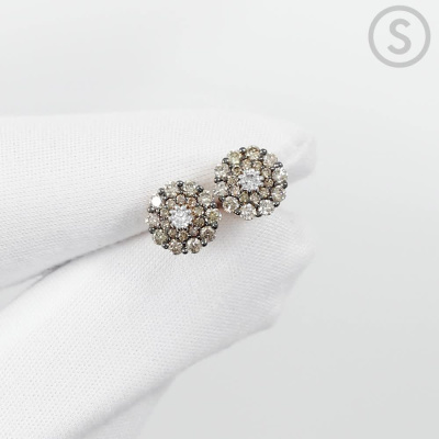 Пусеты с 2 бриллиантами природными, 0.05 карат, огранка круг 57 граней, цвет 3, чистота 6, тип огранки А; 20 бриллиантами коньячными природными, 0.32 карат, огранка круг 57 граней, цвет 7, чистота 5, тип огранки А; 20 бриллиантами коньячными природными, 0.08 карат, огранка круг 57 граней, цвет 7, чистота 5, тип огранки А; Розовое золото 585 пробы.