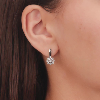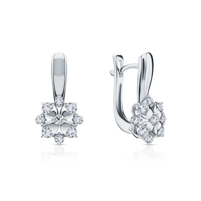Серьги с 8 бриллиантами природными, 0.4 карат, огранка круг 57 граней, цвет 3, чистота 6, тип огранки А; 2 бриллиантами природными, 0.06 карат, огранка круг 57 граней, цвет 3, чистота 6, тип огранки А; 8 бриллиантами природными, 0.15 карат, огранка круг 57 граней, цвет 3, чистота 6, тип огранки А; Белое золото 585 пробы.
