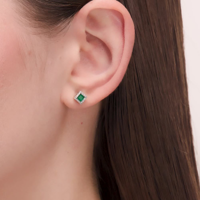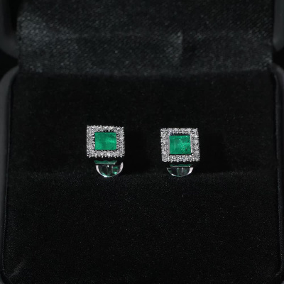 Серьги с 40 бриллиантами природными, 0.08 карат, огранка круг 17 граней, цвет 2, чистота 3, тип огранки Б; 2 изумрудами природными, 0.47 карат, цвет 4, чистота 3, тип огранки Б; Белое золото 585 пробы.