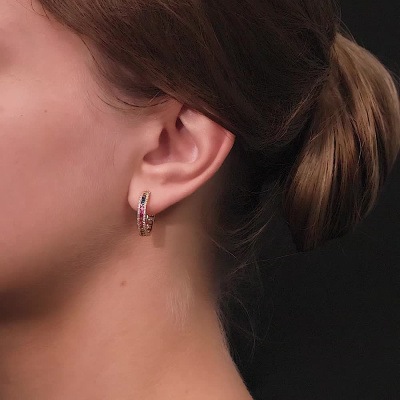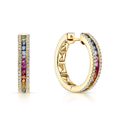 Серьги с 96 бриллиантами природными, 0.25 карат, огранка круг 17 граней, цвет 2, чистота 3, тип огранки Б; 28 сапфирами мульти, 0.82 карат; Желтое золото 585 пробы.