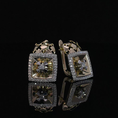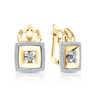 Серьги с 2 бриллиантами природными, 0.11 карат, огранка круг 57 граней, цвет 3, чистота 6, тип огранки А; 72 бриллиантами природными, 0.31 карат, огранка круг 57 граней, цвет 3, чистота 6, тип огранки А; Желтое и белое золото 585 пробы.