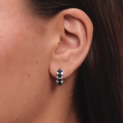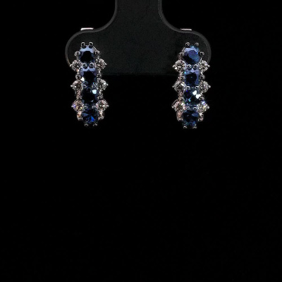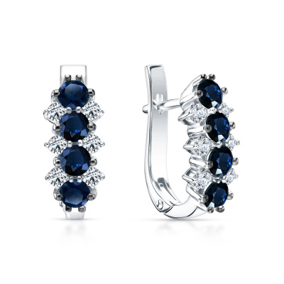 Серьги с 12 бриллиантами природными, 0.39 карат, огранка круг 57 граней, цвет 4, чистота 5, тип огранки А; 8 сапфирами природными, 1.33 карат, цвет 2, чистота 2, тип огранки В; Белое золото 585 пробы.