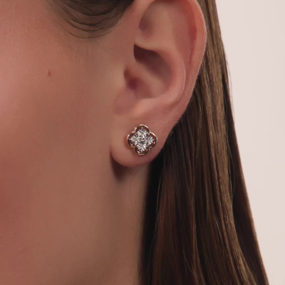 Серьги с 8 бриллиантами природными, 0.02 карат, огранка круг 17 граней, цвет 2, чистота 2, тип огранки А; Розовое и белое золото 585 пробы.