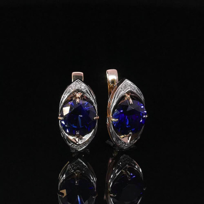 Серьги с 12 бриллиантами природными, 0.04 карат, огранка круг 17 граней, цвет 2, чистота 2, тип огранки А; 2 сапфирами синтетическими, 4.59 карат; Розовое золото 585 пробы.