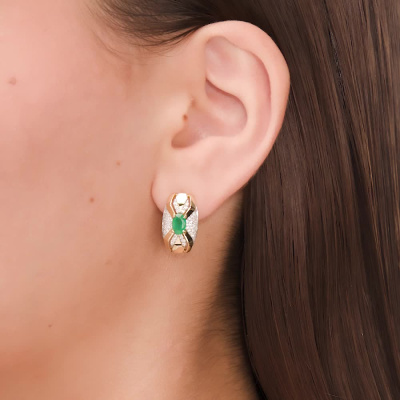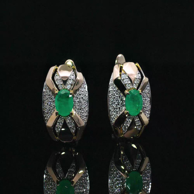 Серьги с 112 бриллиантами природными, 0.31 карат, огранка круг 57 граней, цвет 3, чистота 6, тип огранки А; 2 изумрудами природными, 0.77 карат, цвет 3, чистота 3, тип огранки Б; Желтое золото 585 пробы.