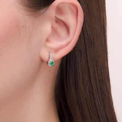 Серьги с 72 бриллиантами природными, 0.19 карат, огранка круг 17 граней, цвет 2, чистота 3; 2 изумрудами природными, 0.51 карат, цвет 3, чистота 3; Белое золото 585 пробы.
