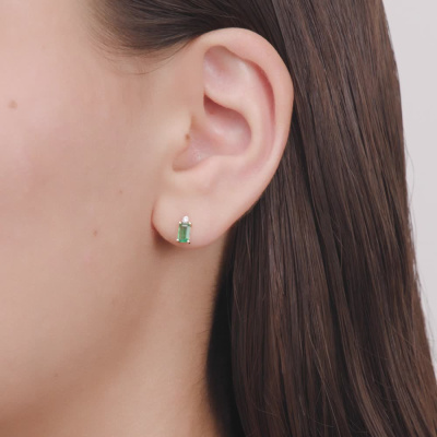 Серьги с 2 бриллиантами природными, 0.04 карат, огранка круг 57 граней, цвет 3, чистота 5; 2 изумрудами природными, 0.51 карат, цвет 3, чистота 3; Желтое золото 585 пробы.