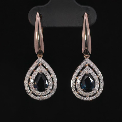 Серьги с 36 бриллиантами природными, 0.29 карат, огранка круг 17 граней, цвет 2, чистота 2, тип огранки А; 64 бриллиантами природными, 0.25 карат, огранка круг 17 граней, цвет 2, чистота 2, тип огранки А; 2 сапфирами природными, 1.6 карат, цвет 2, чистота 2, тип огранки Б; Розовое золото 585 пробы.