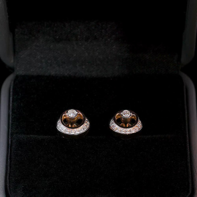 Серьги с 2 бриллиантами природными, 0.06 карат, огранка круг 57 граней, цвет 3, чистота 6, тип огранки А; 36 бриллиантами природными, 0.09 карат, огранка круг 17 граней, цвет 2, чистота 2, тип огранки А; Розовое золото 585 пробы.