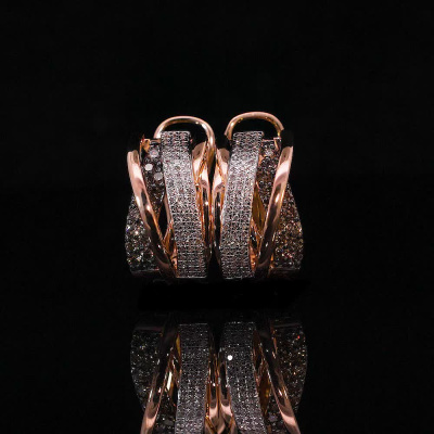 Серьги с 126 бриллиантами природными, 0.22 карат, огранка круг 17 граней, цвет 2, чистота 2, тип огранки А; 28 бриллиантами коньячными природными, 0.33 карат, огранка круг 57 граней, цвет 7, чистота 6, тип огранки А; Розовое золото 585 пробы.