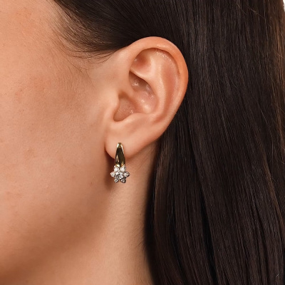 Серьги с 2 бриллиантами природными, 0.32 карат, огранка круг 57 граней, цвет 3, чистота 6, тип огранки А; 12 бриллиантами природными, 0.15 карат, огранка круг 57 граней, цвет 3, чистота 6, тип огранки А; Желтое и белое золото 585 пробы.