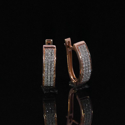 Серьги с 66 бриллиантами природными, 0.18 карат, огранка круг 17 граней, цвет 2, чистота 2, тип огранки А; Розовое золото 585 пробы.