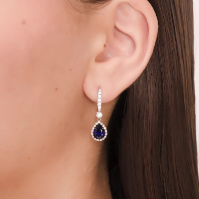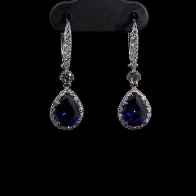 Серьги с 6 бриллиантами природными, 0.13 карат, огранка круг 57 граней, цвет 3, чистота 6, тип огранки А; 4 бриллиантами природными, 0.05 карат, огранка круг 57 граней, цвет 3, чистота 6, тип огранки А; 34 бриллиантами природными, 0.27 карат, огранка круг 17 граней, цвет 2, чистота 2, тип огранки А; 4 бриллиантами природными, 0.01 карат, огранка круг 17 граней, цвет 2, чистота 2, тип огранки А; 2 сапфирами синтетическими, 2.64 карат; 2 сапфирами бесцветными природными, 0.28 карат; Белое золото 585 пробы.