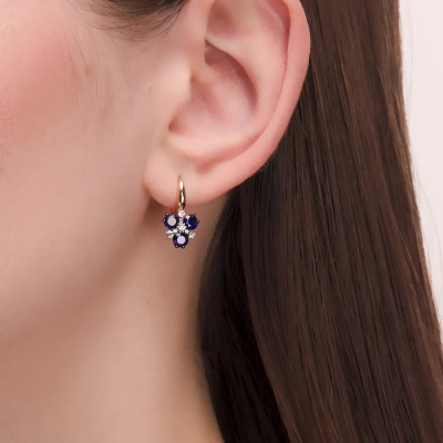 Серьги с 6 бриллиантами природными, 0.02 карат, огранка круг 17 граней, цвет 2, чистота 2, тип огранки А; 6 сапфирами синтетическими, 1.87 карат; 6 сапфирами бесцветными природными, 0.18 карат; 2 сапфирами бесцветными природными, 0.03 карат; Розовое золото 585 пробы.