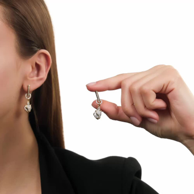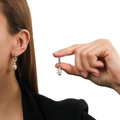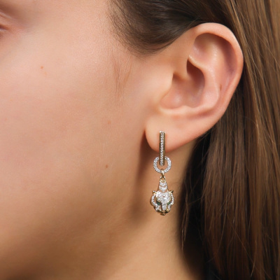 Серьги с 56 бриллиантами природными, 0.18 карат, огранка круг 17 граней, цвет 2, чистота 2, тип огранки А; 98 бриллиантами природными, 0.26 карат, огранка круг 17 граней, цвет 2, чистота 2, тип огранки А; 4 изумрудами природными, 0.03 карат, цвет 3, чистота 3, тип огранки В; Желтое золото 585 пробы.