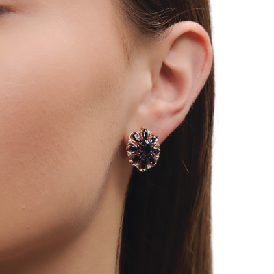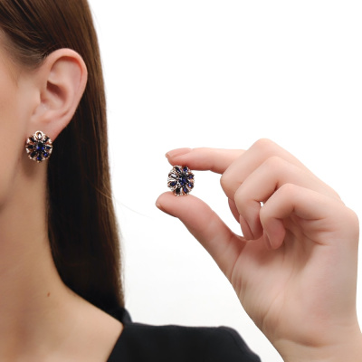 Серьги с 16 бриллиантами природными, 0.12 карат, огранка круг 17 граней, цвет 2, чистота 2, тип огранки А; 2 сапфирами синтетическими, 1.87 карат; 16 сапфирами синтетическими, 2.57 карат; Розовое золото 585 пробы.