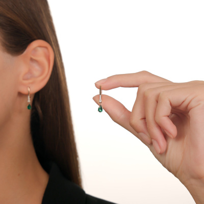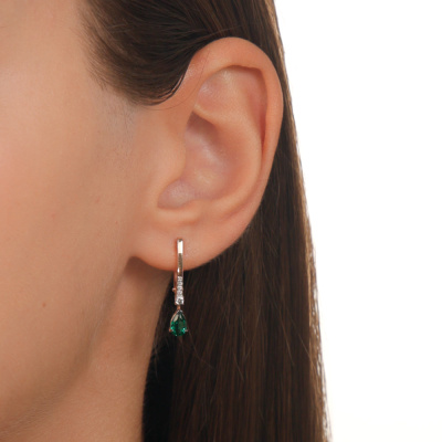 Серьги с 6 бриллиантами природными, 0.02 карат, огранка круг 17 граней, цвет 2, чистота 2, тип огранки А; 2 гидротермальными изумрудами, 0.68 карат; 2 сапфирами бесцветными природными, 0.08 карат; Розовое золото 585 пробы.
