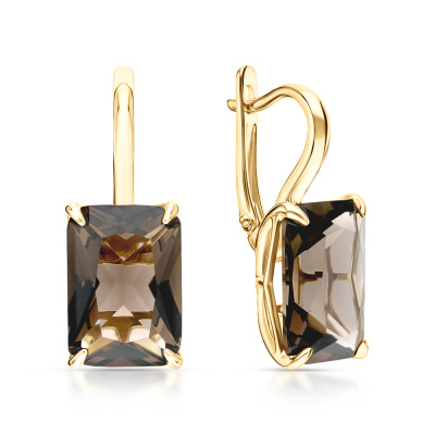 Серьги с 2 кварцами дымчатыми природными, 11.18 карат; Желтое золото 585 пробы.