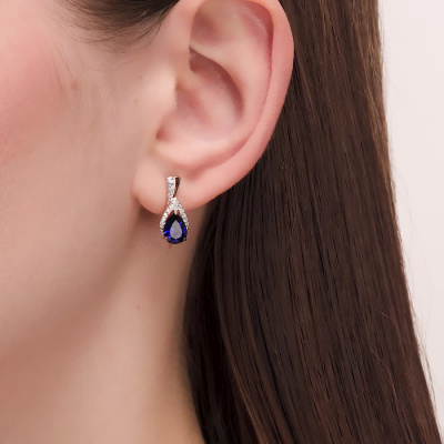Серьги с 14 бриллиантами природными, 0.14 карат, огранка круг 17 граней, цвет 2, чистота 2, тип огранки А; 10 бриллиантами природными, 0.04 карат, огранка круг 17 граней, цвет 2, чистота 2, тип огранки А; 6 бриллиантами природными, 0.02 карат, огранка круг 17 граней, цвет 2, чистота 2, тип огранки А; 2 сапфирами синтетическими, 2.61 карат; Розовое золото 585 пробы.
