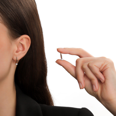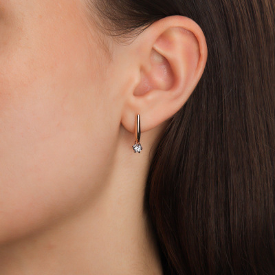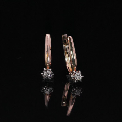 Серьги с 2 бриллиантами природными, 0.11 карат, огранка круг 57 граней, цвет 4, чистота 6, тип огранки А; Розовое золото 585 пробы.