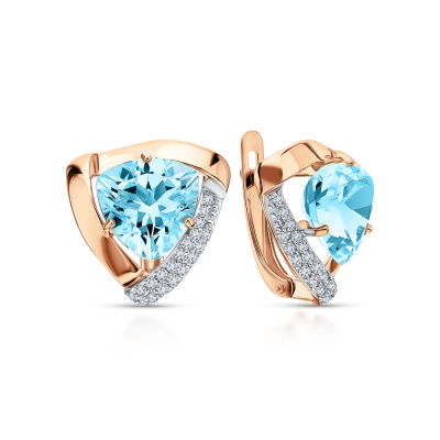 Серьги с 38 бриллиантами природными, 0.17 карат, огранка круг 17 граней, цвет 2, чистота 2; 2 топазами скай природными, 5.85 карат; Розовое золото 585 пробы.