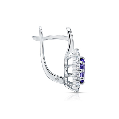 Серьги с 20 бриллиантами природными, 0.73 карат, огранка круг 57 граней, цвет 3, чистота 6, тип огранки А; 2 танзанитами природными, 1.61 карат, тип огранки Б; Белое золото 585 пробы.