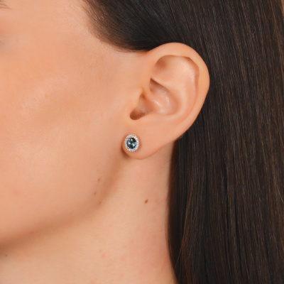 Серьги с 34 бриллиантами природными, 0.15 карат, огранка круг 17 граней, цвет 2, чистота 2, тип огранки А; 2 топазами лондон природными, 1.13 карат; Белое золото 585 пробы.