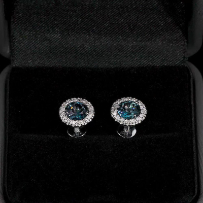 Серьги с 34 бриллиантами природными, 0.16 карат, огранка круг 17 граней, цвет 2, чистота 2, тип огранки А; 2 топазами лондон природными, 1.07 карат; Белое золото 585 пробы.