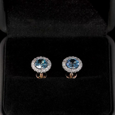 Серьги с 34 бриллиантами природными, 0.16 карат, огранка круг 17 граней, цвет 2, чистота 2, тип огранки А; 2 топазами свисс природными, 1.02 карат; Розовое золото 585 пробы.