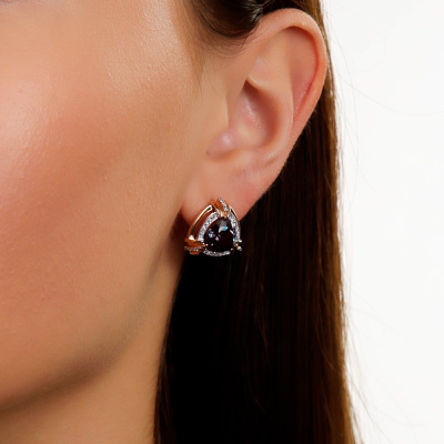 Серьги с 60 бриллиантами природными, 0.17 карат, огранка круг 17 граней, цвет 2, чистота 2, тип огранки Б; 2 александритами синтетическими, 6.97 карат; Розовое золото 585 пробы.