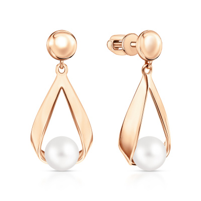 Серьги с 2 жемчугами пресноводными культ.белыми; Розовое золото 585 пробы.