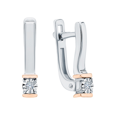 Серьги с 2 бриллиантами природными, 0.01 карат, огранка круг 17 граней, цвет 2, чистота 2, тип огранки Б; элементы из золота Au585; Серебро 925 пробы.