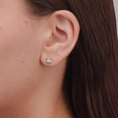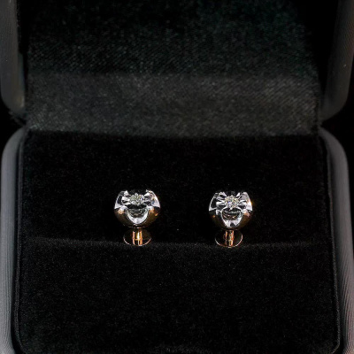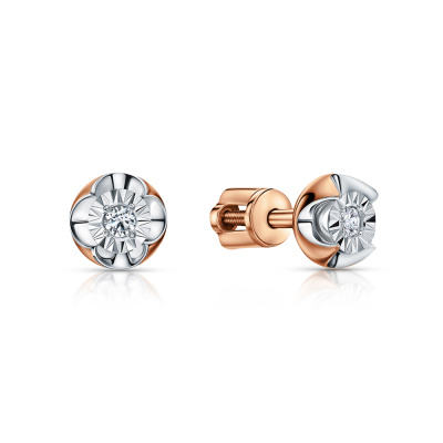 Пусеты с 2 бриллиантами природными, 0.05 карат, огранка круг 57 граней, цвет 3, чистота 6, тип огранки А; Розовое и белое золото 585 пробы.