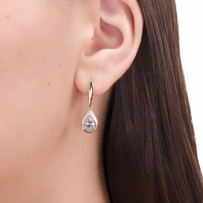 Серьги с 14 бриллиантами природными, 0.06 карат, огранка круг 17 граней, цвет 2, чистота 2, тип огранки Б; 2 топазами скай природными, 1.64 карат; Розовое золото 585 пробы.