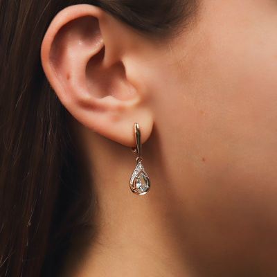 Серьги с 14 бриллиантами природными, 0.05 карат, огранка круг 17 граней, цвет 2, чистота 2, тип огранки А; 2 топазами скай природными, 1.58 карат; Розовое золото 585 пробы.