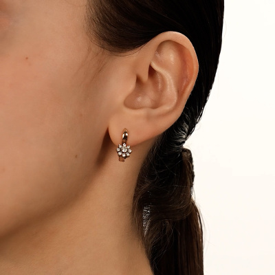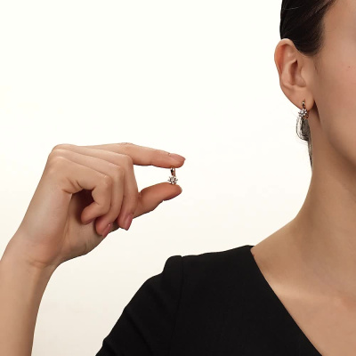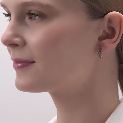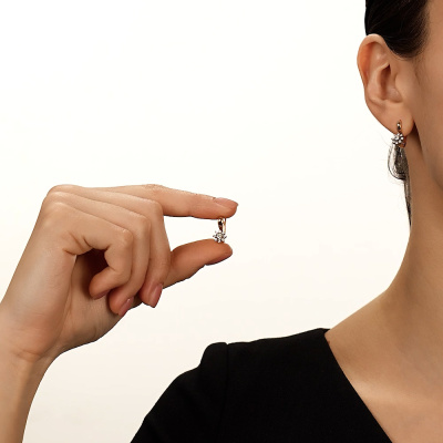 Серьги с 2 бриллиантами природными, 0.17 карат, огранка круг 57 граней, цвет 3, чистота 6, тип огранки А; 16 бриллиантами природными, 0.2 карат, огранка круг 57 граней, цвет 3, чистота 6, тип огранки А; Розовое и белое золото 585 пробы.