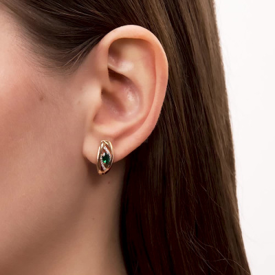 Серьги с 12 бриллиантами природными, 0.03 карат, огранка круг 17 граней, цвет 2, чистота 2, тип огранки А; 12 бриллиантами природными, 0.03 карат, огранка круг 17 граней, цвет 2, чистота 2, тип огранки А; 2 гидротермальными изумрудами, 0.42 карат; Розовое золото 585 пробы.