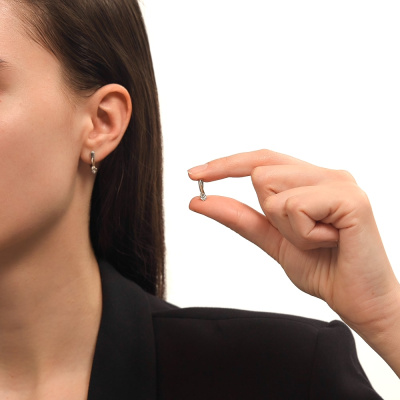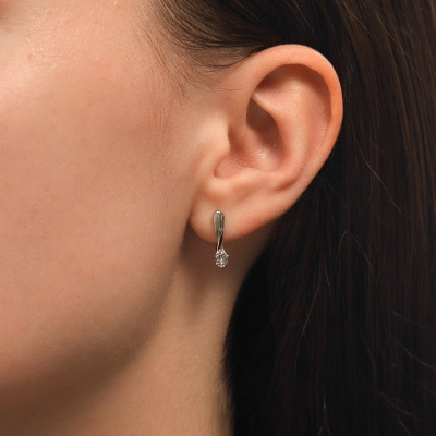 Серьги с 2 бриллиантами природными, 0.01 карат, огранка круг 17 граней, цвет 2, чистота 3, тип огранки Б; элементы из золота Au585, 0.01 карат; Серебро 925 пробы.