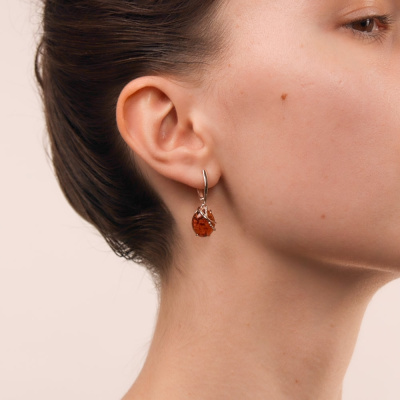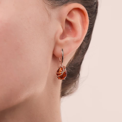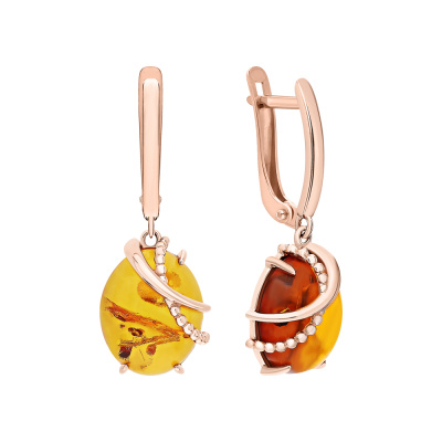 Серьги с 2 янтарями коричневыми природными; Розовое золото 585 пробы.