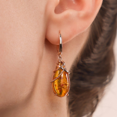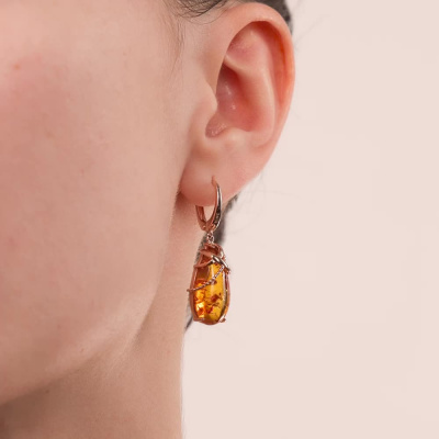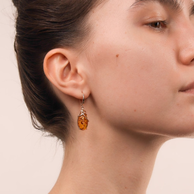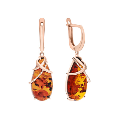Серьги с 2 янтарями коричневыми природными; Розовое золото 585 пробы.